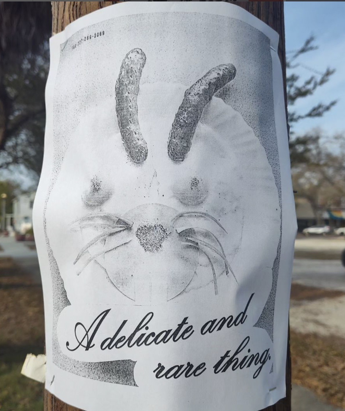 The juxtaposition of the flyer with objects like wires potentially allows us to see the text differently as we think about what could be a “symbolic trap.”