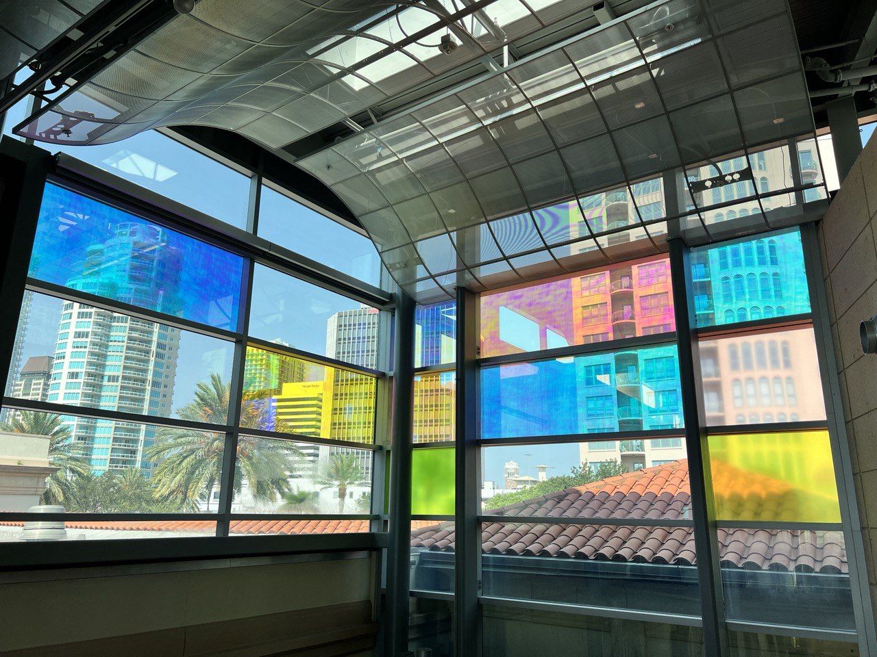 Unlike standard color filters, dichroic films produce different colors depending on the angle at which the light hits them. In the case of the MFA, the result is a colorful grid of color projected onto the Conservatory floor that changes color with the time of day.