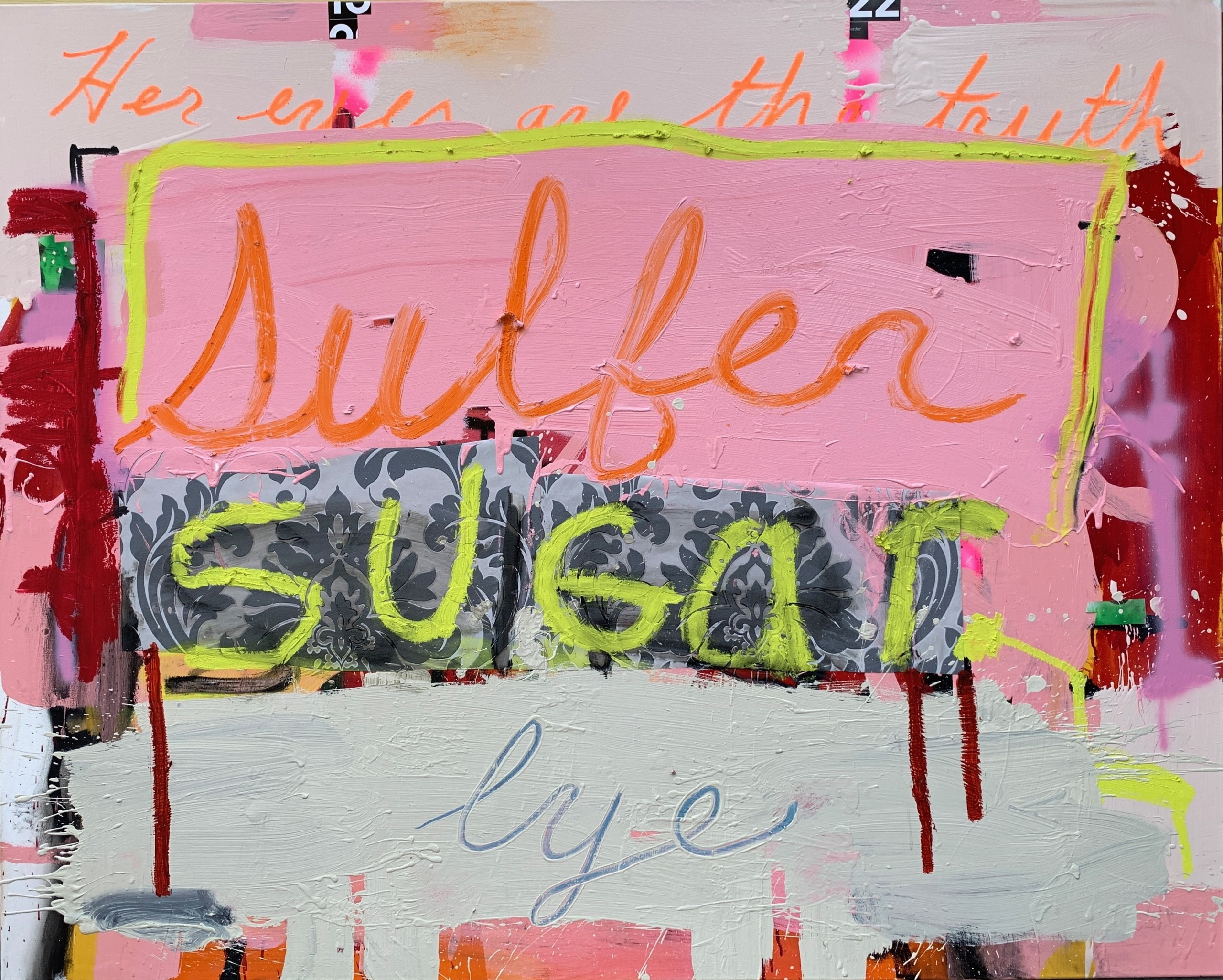 This painting captures the memory of my grandmother telling me about seeing these word written in flames while she was dreaming and telling me at 8 years old that they must be the cure for cancer and that I will need to do something with this information…