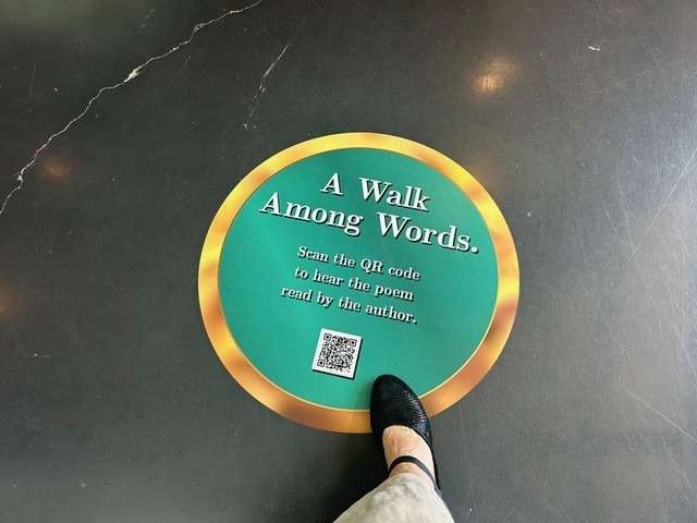 Covid memories popped up and gave me a template. During those years of isolation, floor signs on the floors of public buildings, supermarkets, doctors’ offices, and libraries directed us to be careful and keep our distance. The signage, discreet but influential, got people’s attention. The idea evolved. Could I record the poems and place indicators on the same kind of floor signs?