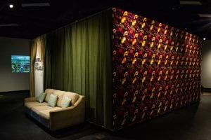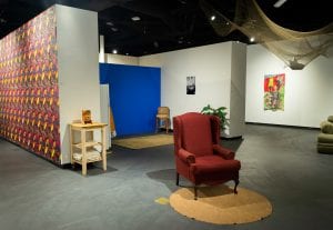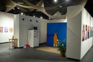 Walking into the Arroz con Frijoles exhibition in USF’s Carolyn Wilson Gallery offers a sense of homecoming. There is music, colorful screen-printed wallpaper, a replica of a kitchen busy with the knickknacks of everyday. From the hung curtains that frame the exhibit’s title to the mixed media corn husk installation, the exhibit offers a textural and sensory exploration of Latinx culture.