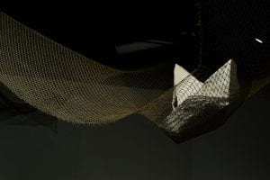 “We are all family and we had family helping us put this together,” artist Alejandro Gómez explains while pointing out the curtains his mom sewed for the show. A Cuban-American, Gómez’s art in the exhibit centers around migration. The young artist works with paper and textiles to create vehicles of passage via sea and air.