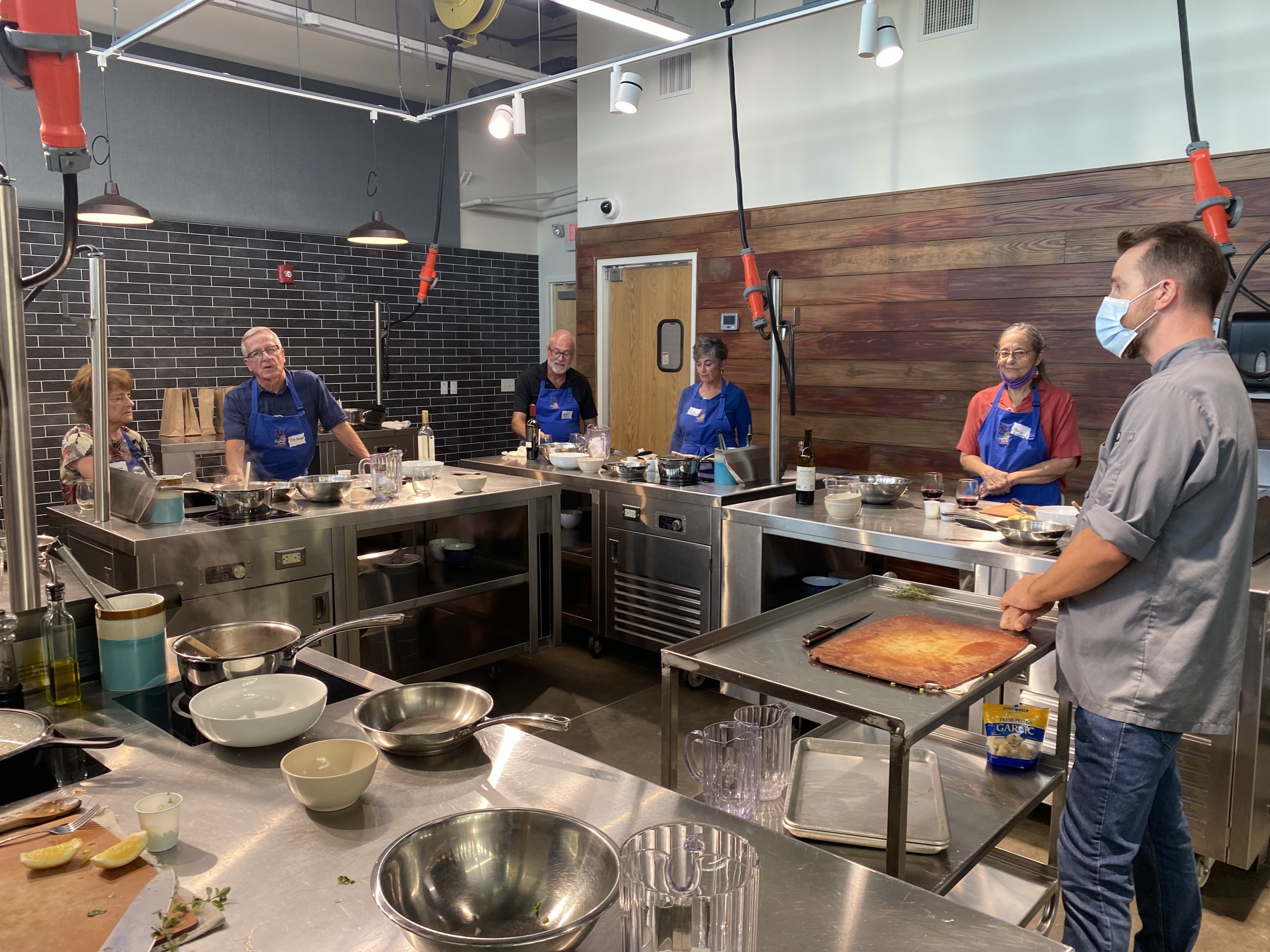 She and I arrived at DFAC 10 minutes before the 6:30 p.m. class, as instructed. After we had our temperatures checked at the front door, we were directed to the second floor. There, in a 1,400-square-foot teaching kitchen, Tinling and his assistant Alina Berje greeted us with aprons and two glasses for the BYO wine we had been encouraged to bring along (Anthea chose a Pinot Noir, I contributed a light Cab). Tinling then led us to a stainless-steel cooking station. The class was full – 10 students were paired two by two at the kitchen’s five stations. While Anthea and I were first timers, Linda Shutt Atkins and David Atkins of Dunedin, occupying the station next to us, admitted they were confirmed recidivists.