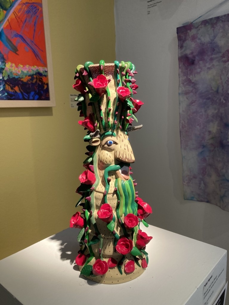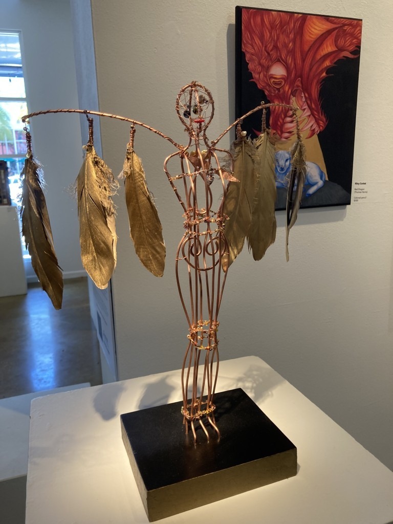 One of my favorite pieces in the show was inspired by one of my favorite books – Connie Mae Fowler’s Before Women Had Wings. Rebecca Skelton (who is married to Wallis) contributed an angelic figure made with copper wire and wings with hanging feathers. The piece was awarded the Mark Pfeiffer Memorial Award for Sculpture.