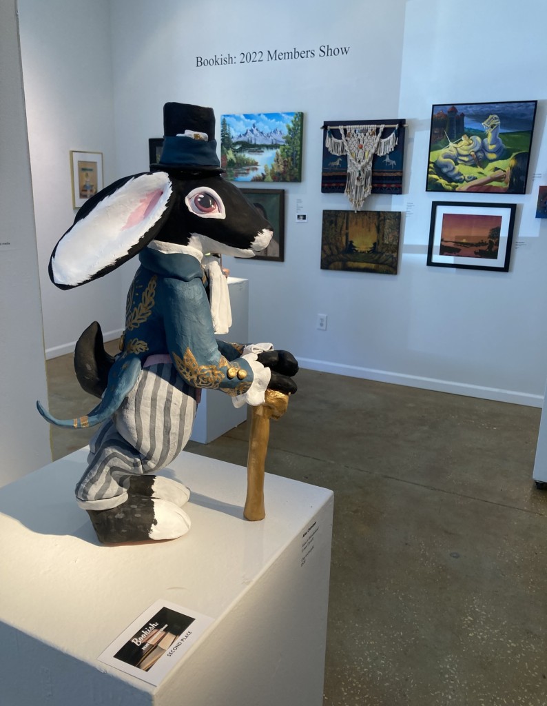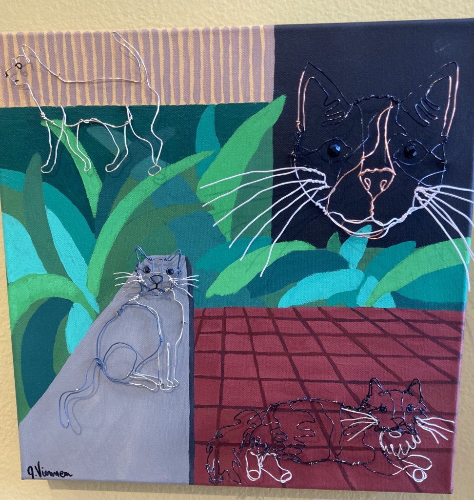 But then again, a lot of the works in this show seemed to be pushing beyond their normal boundaries. I was struck by, for example, how many of the paintings on display popped out of their usual 2D state. It was as if the book ideas that inspired them could not be limited to a flat surface, but needed to emerge full blown like the images in our heads when we read. Especially enchanting were the wire whiskers emerging into space from Judy Vienneau‘s entry based on Life Lessons from the Cat, one of the titles in the Chicken Soup for the Soul series by editor and publisher Amy Newark. Vienneau, the founder and director of Gulf Coast Artists’ Alliance, Inc., specializes in wire sculpture, mixed media with wire and graphic design.