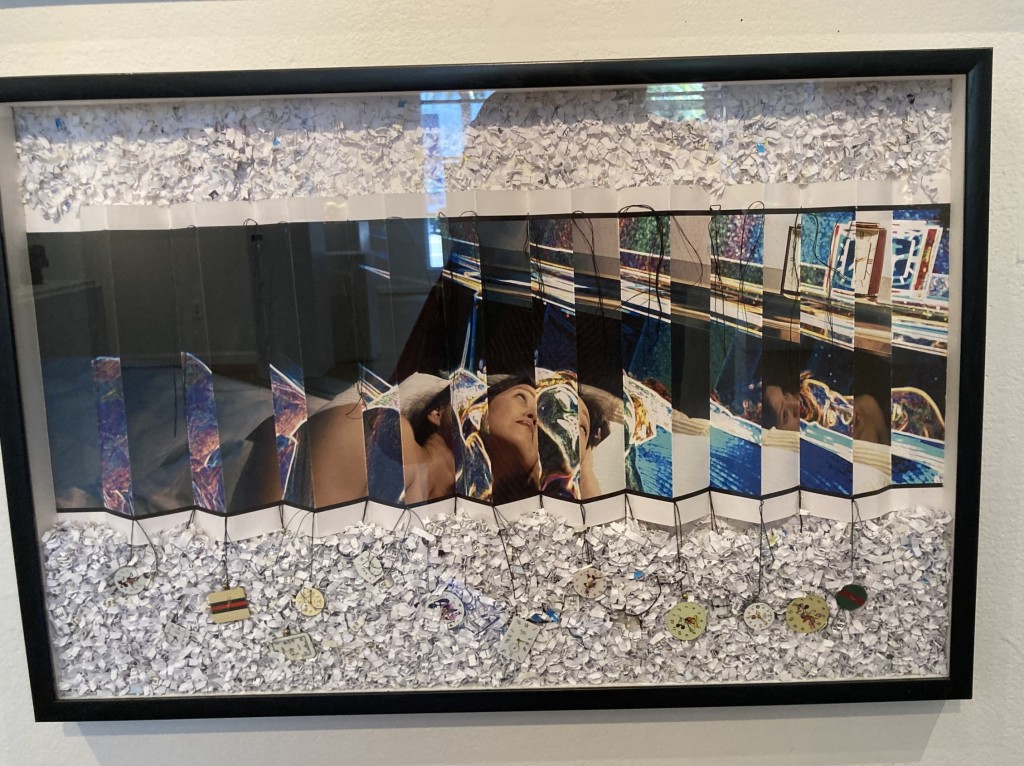 Also inspired by poetry, mixed media artist CeCe Skeith offered a dream-like piece in homage to Devon Attaei’s I Can’t Sleep… – a photograph of a reclining woman severed into strips set among shredded paper and broken watches. Of course she can’t sleep!