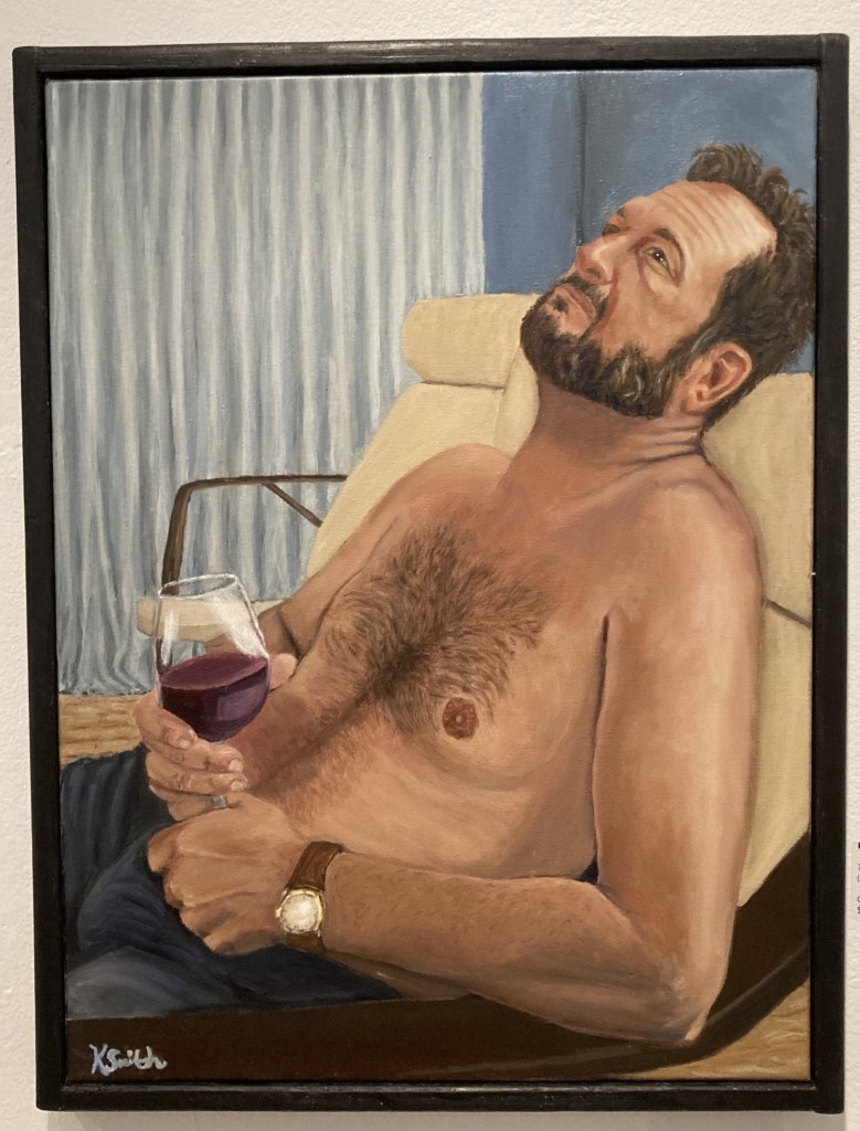 Some of the pieces in the show left me wondering just what the artist was trying to say about the books they chose — especially if it was a title I hadn’t read yet. Was Kathy Smith inspired by the alcoholic writer in Charles Jackson’s The Lost Weekend when she painted a man cradling a glass of red wine or was the man in the painting her own lost weekend?