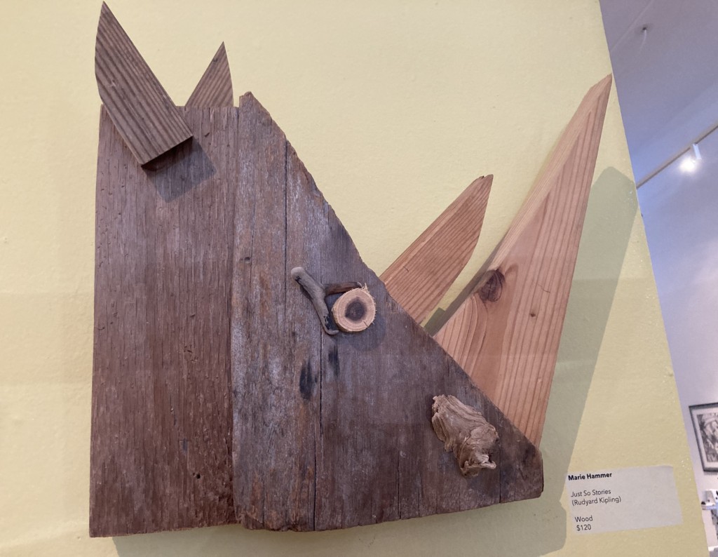 Marie Hammer’s minimalist bas relief, made entirely of simple wood pieces, brought to life Rudyard Kipling’s Just So Stories while I half expected Eckerd College student Atlas Chamber’s whimsical rabbit, straight out of Alice in Wonderland, to hop off the pedestal and yell “I’m late, I’m late!”
