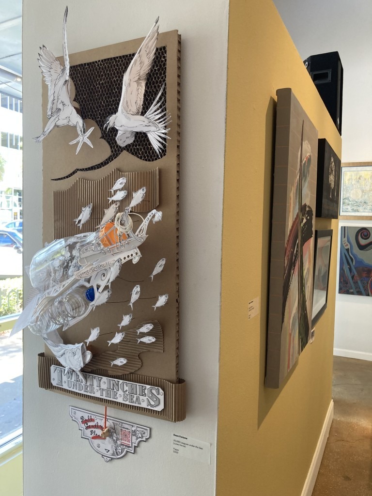 The work based on the classic Jules Verne novel 20,000 Leagues Under the Sea also floated out into the viewer’s space, artfully conveying a strong environmental message. Depicting a ship made of two plastic bottles navigating through a sea of corrugated cardboard and paper fish with paper seabirds flying above, artist Dean Fortune‘s mixed media artwork wryly included the label Twenty Inches Under the Sea. Beneath that title was a pull chain with the instructions – “Pull Gently Please.”