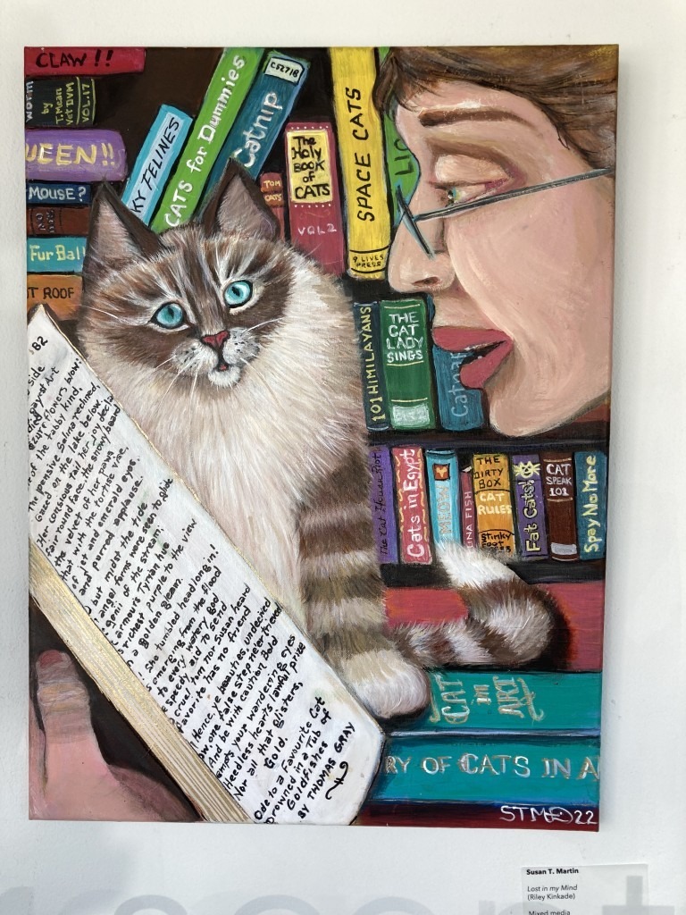 To illustrate the Kinkade collection, Susan T. Martin, an artist with a bipolar disorder, painted a bespectacled woman in front of a bookshelf filled with cat books. She seemed to be reading Thomas Gray’s “Ode on the Death of a Favourite Cat Drowned in a Tub of Goldfishes” to her cat. I’m not sure how this connects to Kinkade’s poetry, but it certainly piqued my interest to find out.