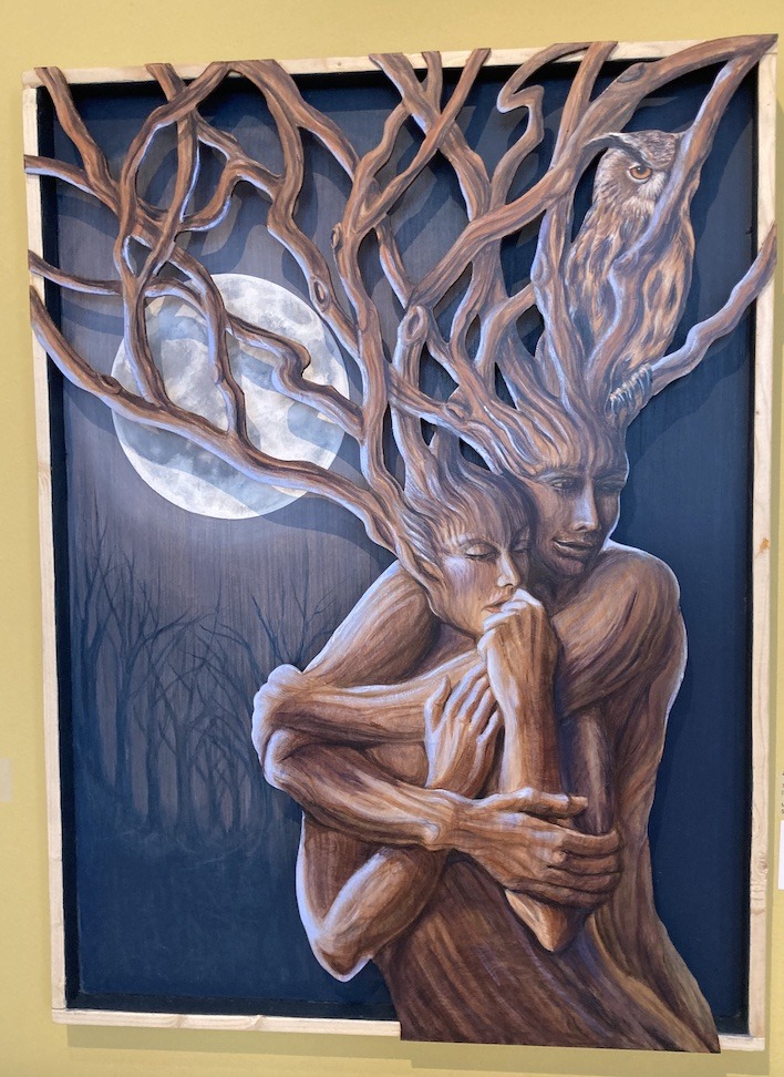 Thanks to Judith Villavisanis’s eye-popping mixed media piece of a tree come to life under the light of a full Moon (which won the show’s Raymond-James Sponsor Award), I now want to read Canadian Deborah Dunleavy’s 2015 young adult novel about sex, death and grief called The Truth About Trees. Villavisanis’s more demure figurative paintings are currently on display at the Brenda McMahon Gallery in Gulfport.