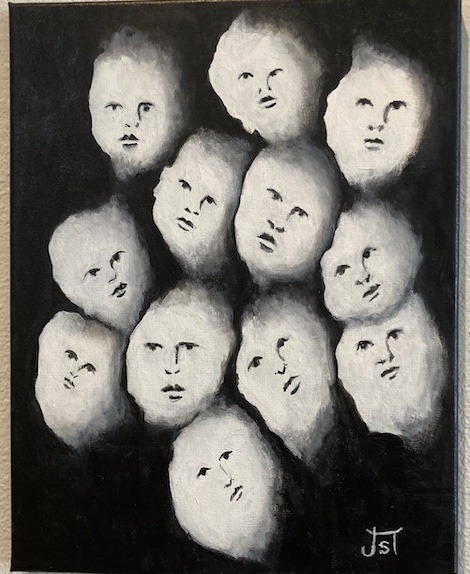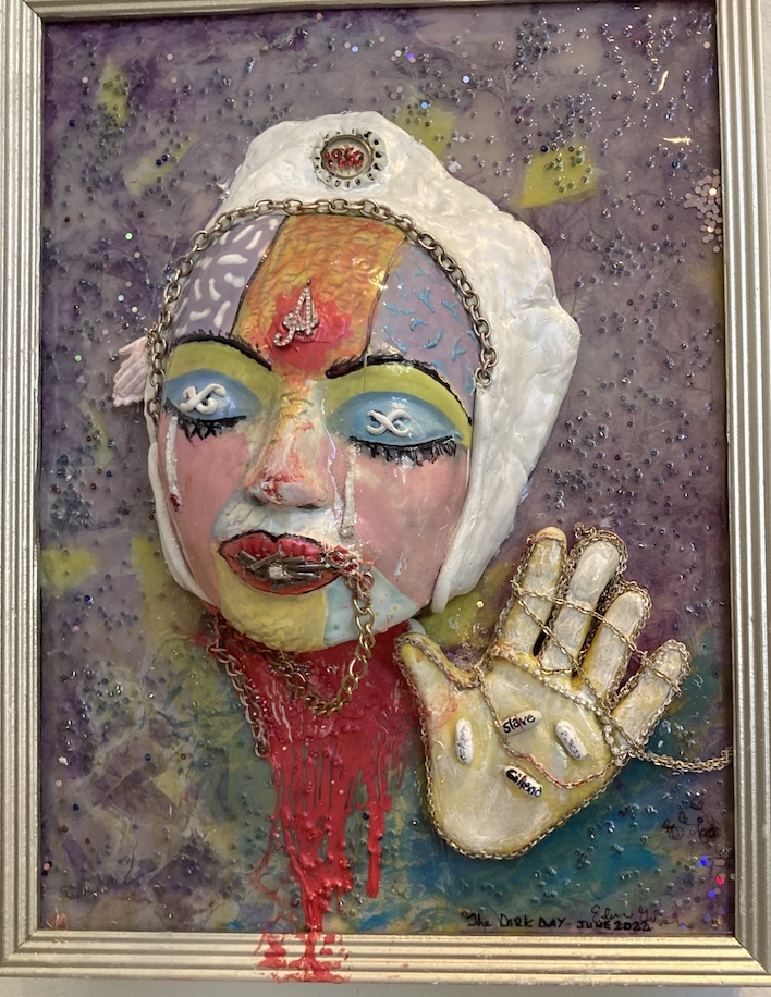 In Eileen Goldenberg’s mixed media piece, The Handmaid Tale (Margaret Atwood), the grotesque visage of clay popping out of the canvas seemed appropriately terrifying.