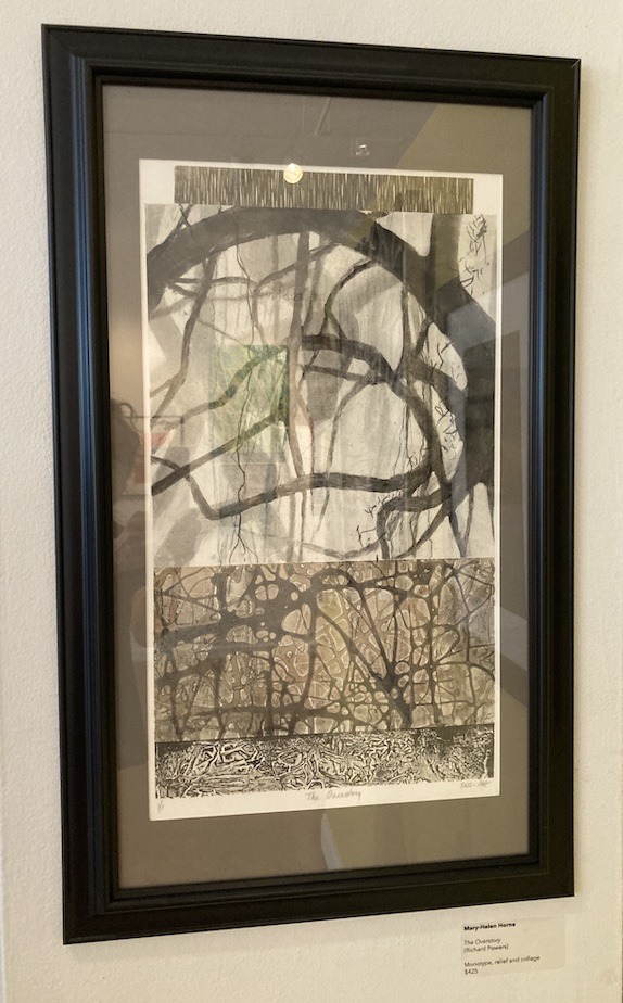 Mary Helen Horne’s textured collage of entangled branches beautifully caught the spirit of The Overstory, Richard Powers’ powerful novel celebrating the intricate communication network of trees.