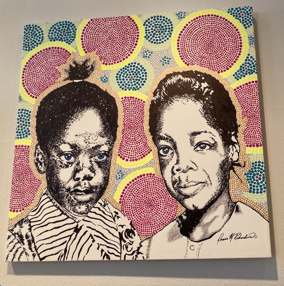 Donna M. Richardson chose to illustrate Toni Morrison’s The Bluest Eye with a black-and-white drawing of two Black figures with bright blue eyes set against a dizzying background of colorful pinwheels, echoing poignantly the novel’s theme of racial disparity. Richardson won the Margaret Murphy Steward Best of Show for the piece.