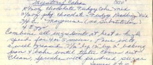 I don’t do much complex cooking anymore like I did in the past. But, here is a handwritten recipe for my Mom’s Mystery Cake. It sounds gross, but it was delicious!