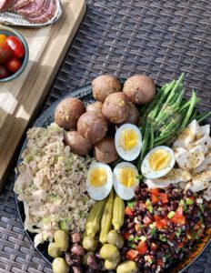 Salad Niçoise is a meal that invites endless variation, and it offers a change of pace in summer. Besides the pepper salami, cherry tomatoes, boiled eggs, sliced chicken, haricots verts and boiled potatoes with lemon-pepper butter, tuna salad, olives and pickled okra, the spread pictured includes a Black Bean Salad from a recipe that has been a consistent crowd pleaser for decades.