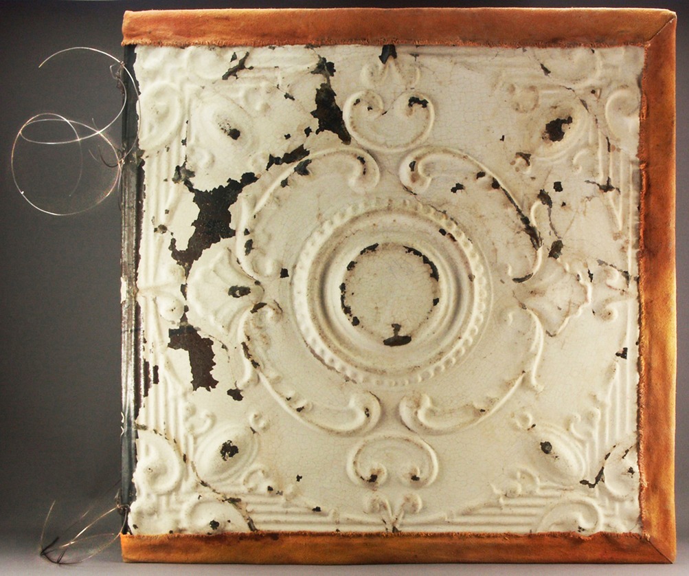 The large book, the Alchemical Text, was made from rust, tin, linen, intaglio, lithographs and paper. Created by working outside, placing paper onto rusted ceiling tin tiles and letting the Florida rain pummel the paper into the rust surface, thereby creating a matrix for each page.
