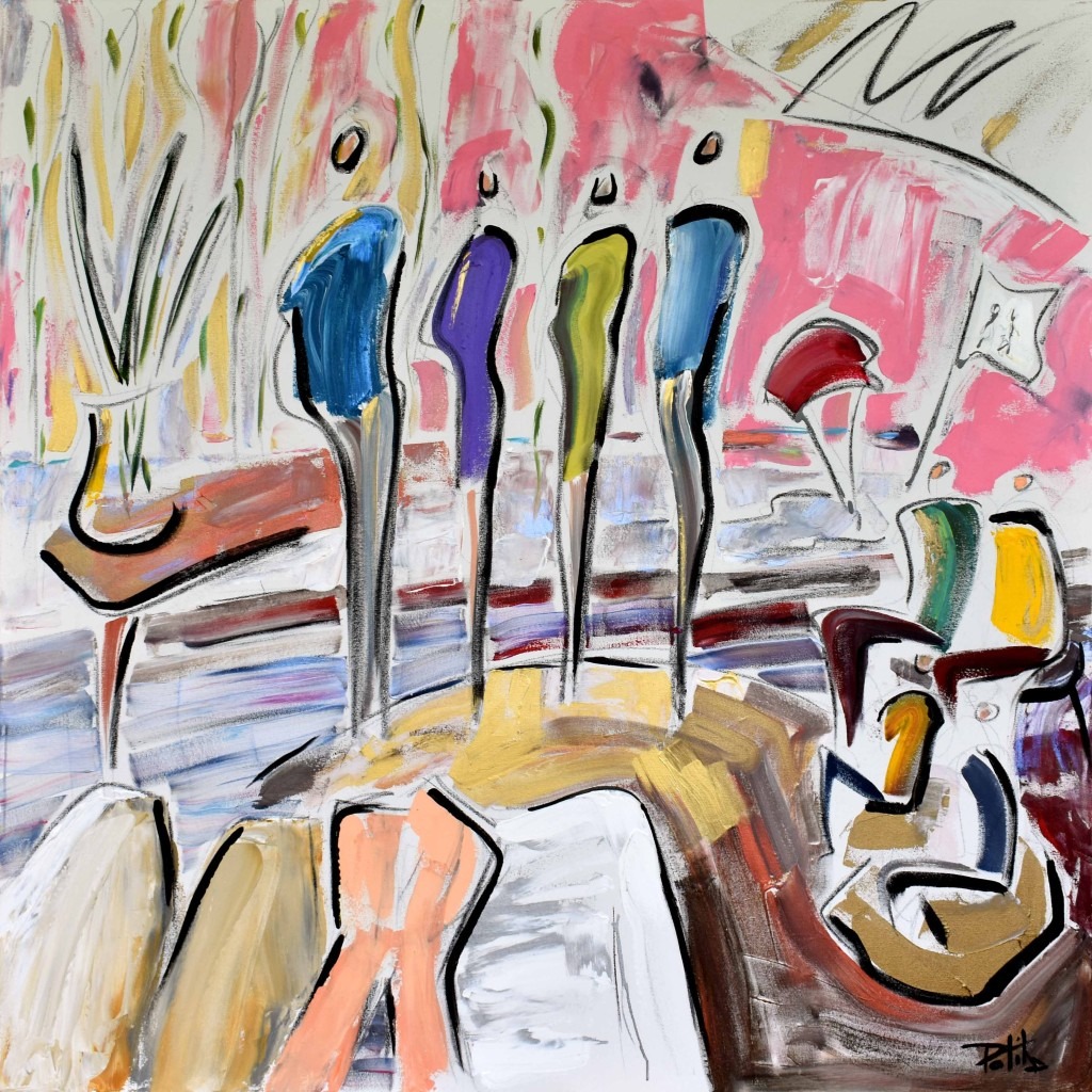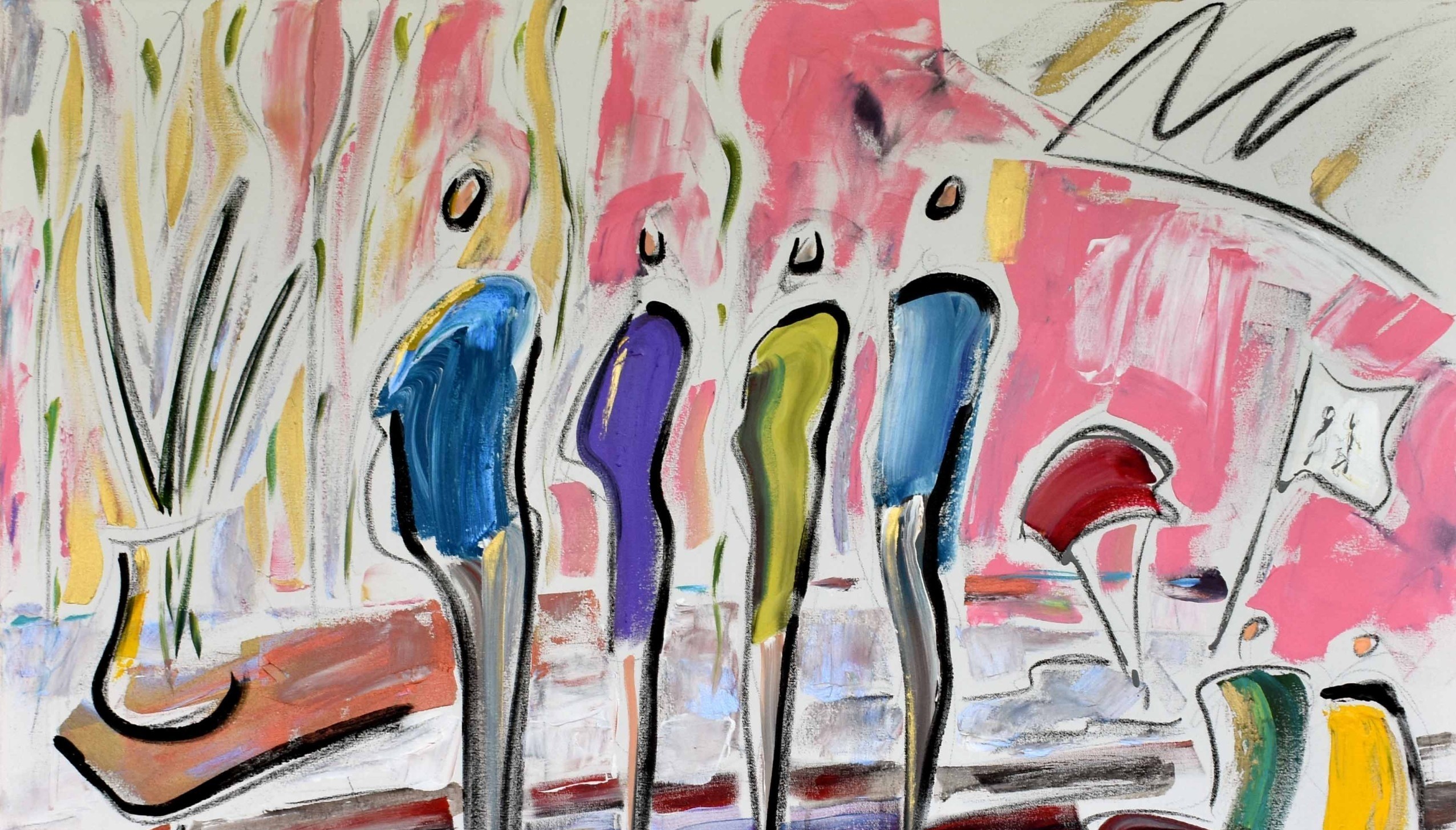 The painting called Dream Week (♥ matter) is about the week of our wedding in Jericoacoara, Brazil. A week that we spent with only our closest friends and family, mixing our cultures from Brazil and France and seeing connections and friendships being created as if there were no language barriers. Everyone was so intensely connected that there was this shared feeling as if time had stopped only to host those intense moments.