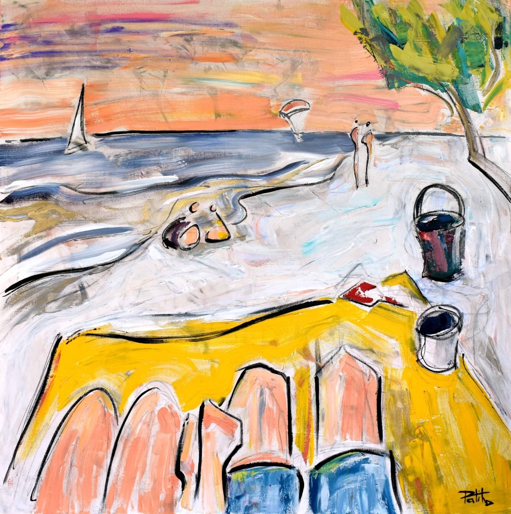 – This painting shows an ordinary day at Honeymoon Island State Park in Dunedin. When we sit together and watch the kids play on the sand, we often get emotional thinking about the miracle of life and the luck we have, to LIVE in such an amazing planet. The sailboat is there to represent the physical presence of the wind and the kite comes back as a reminder and symbol of our lives with all its adventures, excitement, emotions, love, fears, doubts, challenges, conquers and pure joy. –