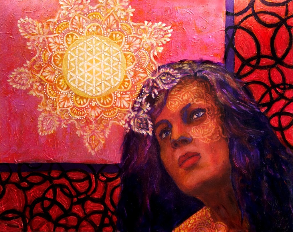 In the acrylic painting series, SACRED SPACES, mandalas are used to create sacred spaces in which we can contemplate and expand our understanding of life and self.