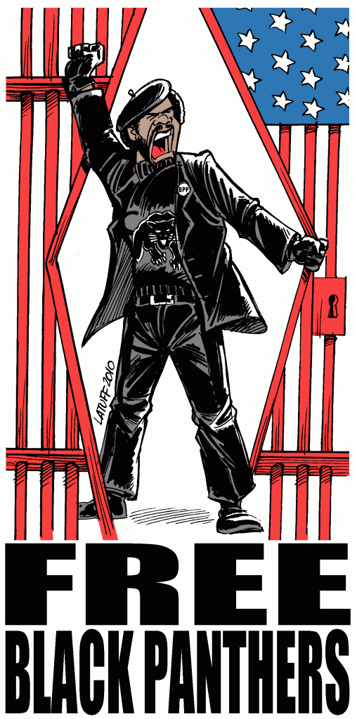Cartoon by Carlos Latuff, made for Black Panther Larry Pinkney, on behalf of Black Panther members jailed in US prisons – Public Domain