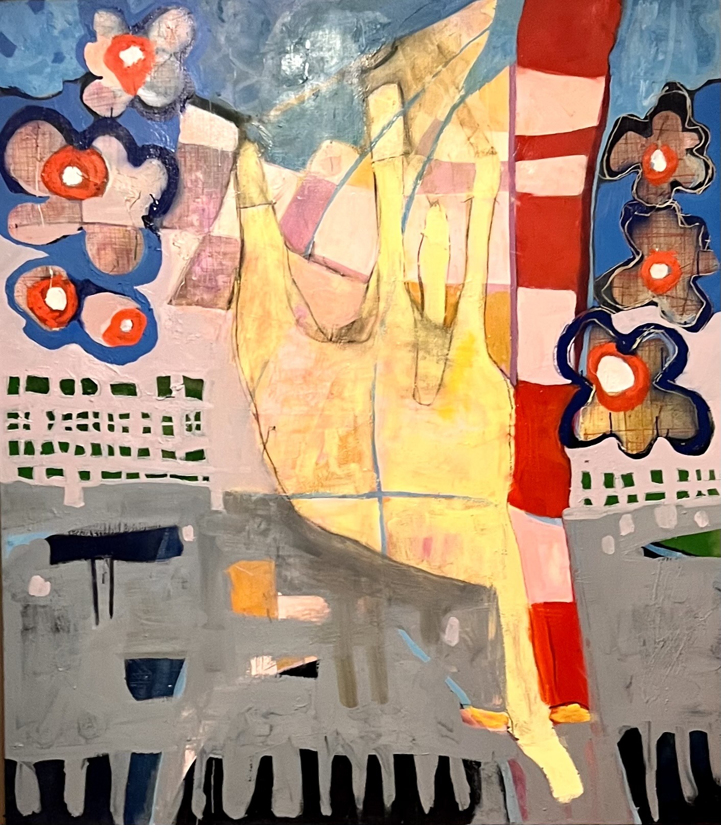 These paintings are included in a migration series. Here one sees an upside down “giraffe”. In the simplest terms the upside down animal symbolizes the displacement that is occurring through climate change. The other piece is more human. I am using the idea of the peritoneum, “the serous membrane lining the cavity of the abdomen and covering the abdominal walls” Oxford Language Dictionary. It’s the organ that protects and insulates the other organs. It holds it all together. I am alluding to two figures held together with heart and guts and veins walking toward something better while interconnected with all else.