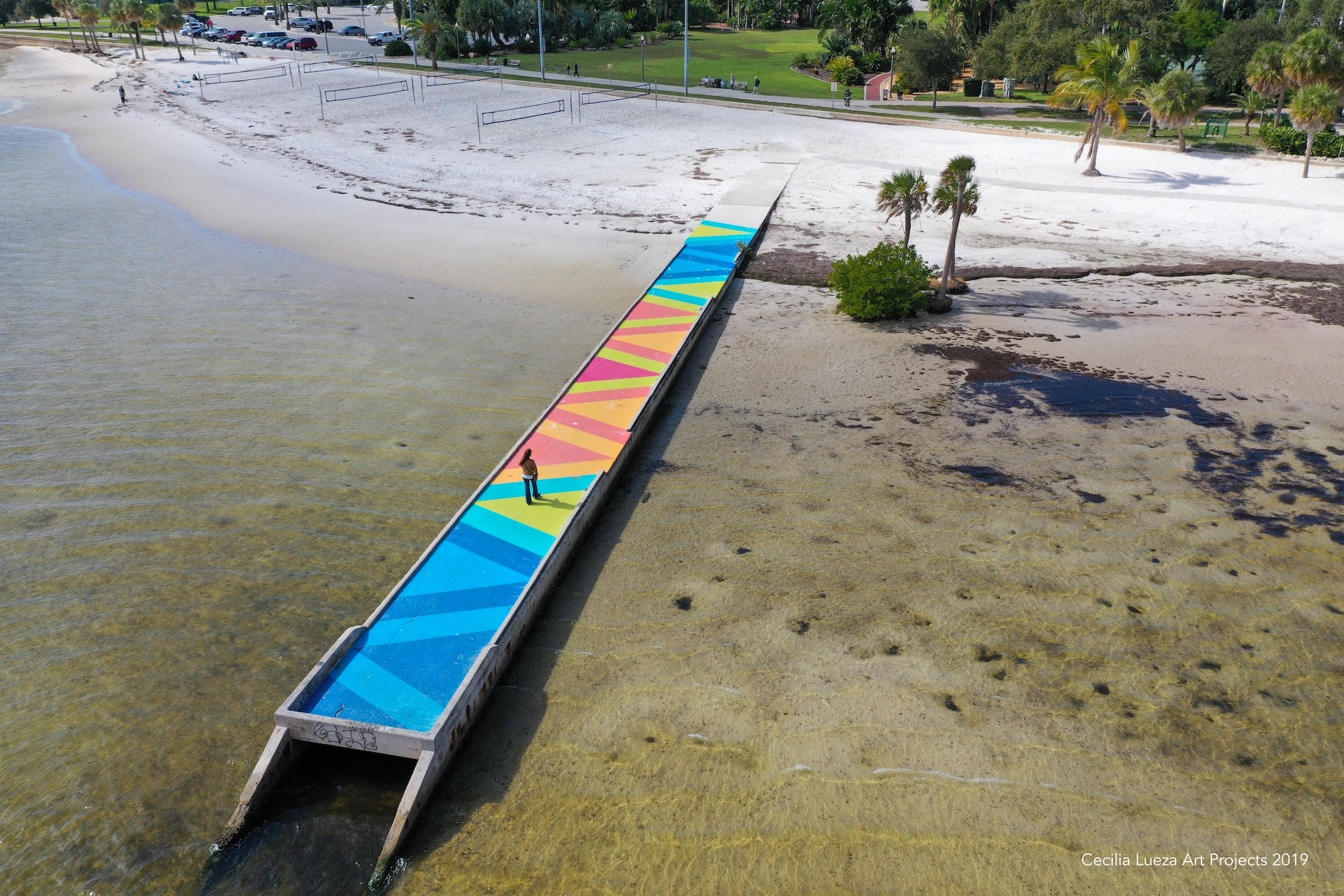 A SHINE Mural Fest creation by Cecilia Lueza, this time on a pier stretching into the Bay just north of downtown St. Pete, at North Shore Park