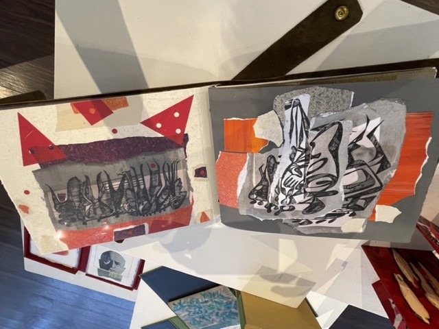 Barancik’s leather-bound book of 34 mixed media collages was a “collection of exquisite pieces of artwork. . . collage, stunning drawings and woodblock prints featuring Barancik’s signature mark-making of striking black and white tones.” – Robin Perry Dana.