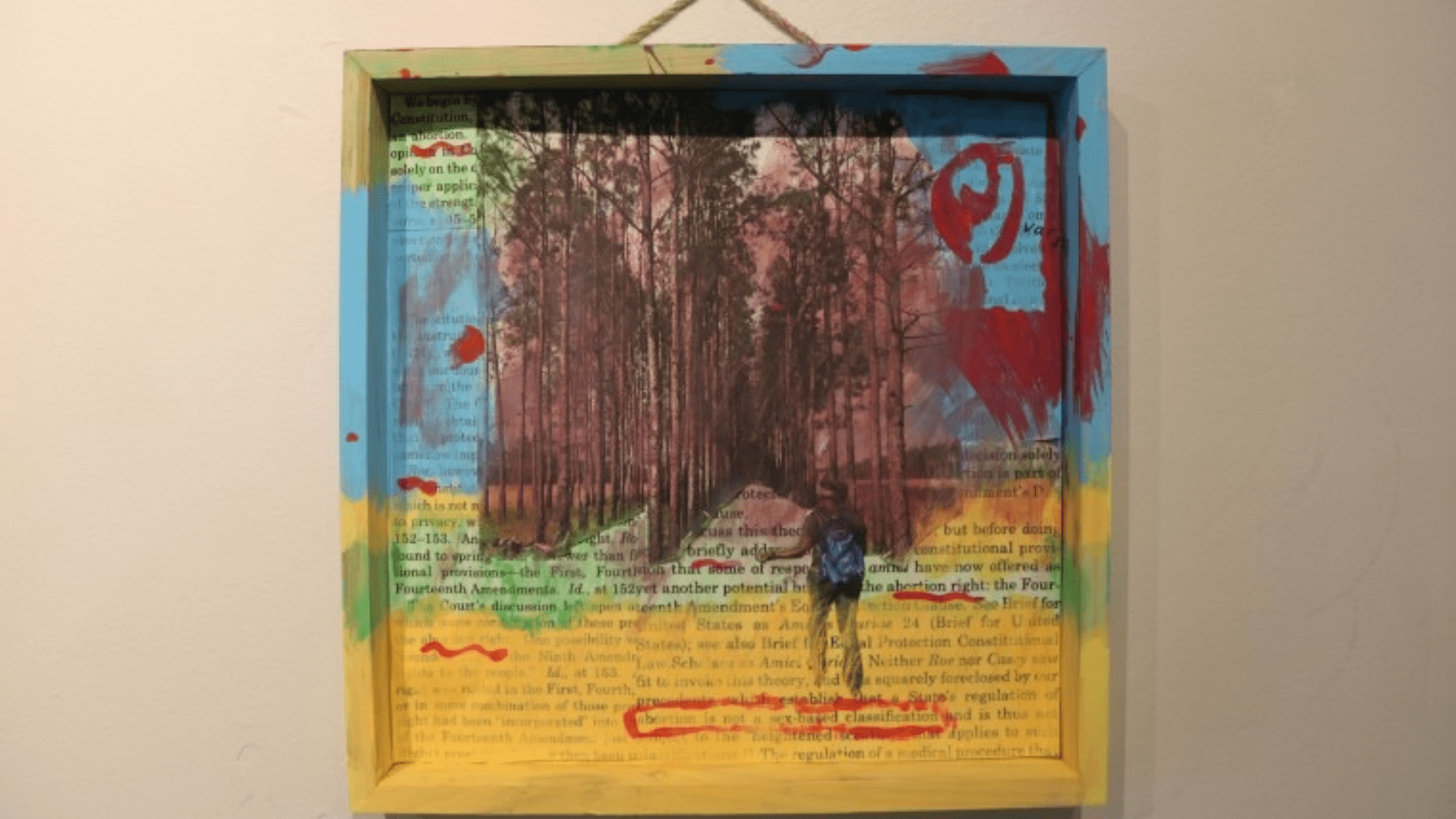 Using a mixed media approach combining images of a wooded area of Tampa that she hikes in, with tree sprigs and text, she contrasts the “space that I feel so free in, with this language that was making me not feel free.”
