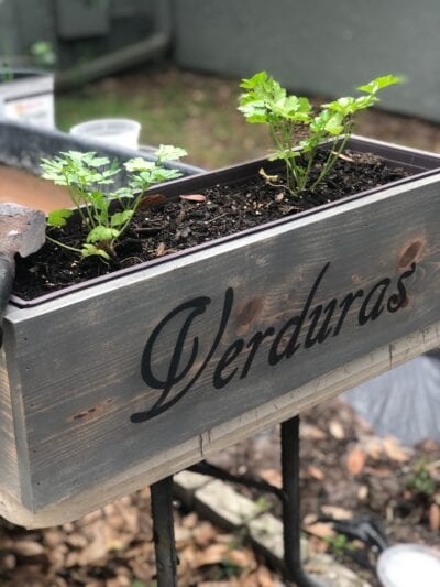 I walk outside into a garden full of plants that we have grown from seeds and bulbs, including parsley, rosemary, oregano, thyme, potatoes, red cabbage, kale, lemongrass, and swiss chard. There are also flowers galore. Just the other day, we ate potatoes and herbs for breakfast, all straight from the garden. The very box that our parsley is planted in was a homemade gift from my husband – “Verduras,” it says. Vegetables.