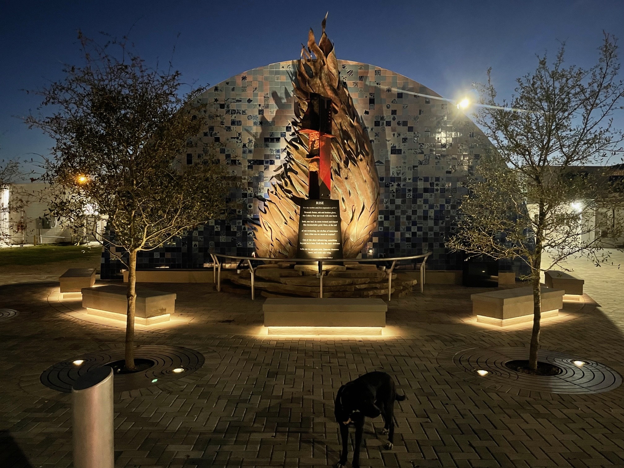 “The arched wall is clad with hand-painted tile created through multiple community events to give people a physical connection to the monument. The piece of steel I-beam from Tower 1 sits atop a black granite pylon that has Helen’s poem etched into it. The granite pylon is rising up through a broken pile of limestone meant to represent the destruction of that day.”