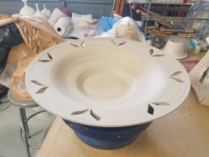 One thing that all potters know is that every time we touch a piece, we have a chance to ruin it. Cutting into it with a sharp knife increases that risk exponentially. That is what makes this part SO much fun. Once I jump in there, turning back is not an option. This will be the design that helps me to create fluid contrast. At least that’s the plan…