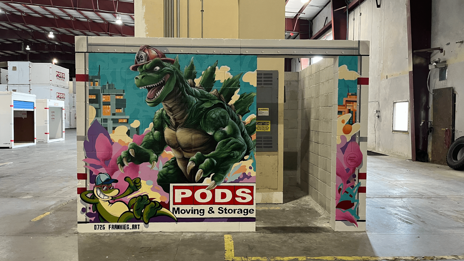 Creative Pinellas and PODS partnered to bring a dynamic new mural to life inside the PODS Storage Center at 3705 62nd Ave N in Pinellas Park. Designed by artist Francisco “Frankie G” Gonzalez, Destinations is a four-sided mural that transforms the heart of the Storage Center into a celebration of PODS’s journey and the people who power it. At the core of the mural is a strikingly detailed replica of a Gen 6 PODS container—complete with riveted edges, signature blue door, and the iconic PODS logo—anchoring the artwork in the company’s identity and innovation.