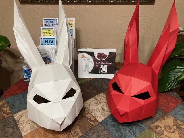 In the script, the actor (who can be any gender) is immediately instructed to place the vial next to the two glasses (which may or may not have poison mixed into one of them). During the course of the play when there is a need for a carrot (remember, this is a play that involves rabbits) and an entrance fee (it turns out that even rabbits need money from time to time), the actor is instructed to ask audience members to provide a dollar bill or a carrot — or at least something that could stand in for a carrot.
