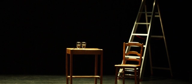 Both nights I saw White Rabbit, Red Rabbit there wasn’t really a stage, just a space carved out in the hall of a church and in a gallery space in front of rows of folding chairs. There wasn’t much in the way of a set or props either. A ladder. A table with two glasses filled with water. And a vial (which may or may not be filled with poison) which was handed to the actor when she arrived at the theater.
