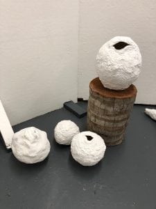 After a long day of painting and gessoing, which really aren’t that creative things to do, it’s nice to flex some mental muscles by playing with sculpture placement and object combinations. I almost never know what color I want a sculpture to be when I start making it, let alone what shape it will take or what object it will ultimately end up with (if any at all). Those questions are usually the last ones answered. Because of that, I usually take a while to really live with the individual sculptures and marinate on ideas with them. Part of today was one of those days. Just move things around, sit and look. Most of the time there’s no “Aha!” moment of what it should be, but usually there are some instant answers about what it shouldn’t be. This kinda puzzle work feels like the most important work involved in making sculptures: not the labor involved in getting the clay to stand or getting the paint to adhere properly or sanding off jagged corners (which are all necessary). Moving my body in space and switching up the jigsaw puzzle combo of works in process feels like where I really become an artist: where I have to decide between several options that usually aren’t better or worse than the other, just different answers that yield different results. So then, what results do I want from my work? Do they change over time? From one piece to another? Can I show several pieces with different “goals” in the same exhibit without it feeling disjointed? Decisions, decisions.