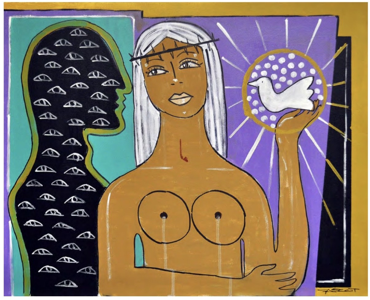 “The dove in her hand is a symbol of the peace she must find within to stand strong and unwavering in the face of circumstances beyond her control. The stitching represents healing.” – John Gascot