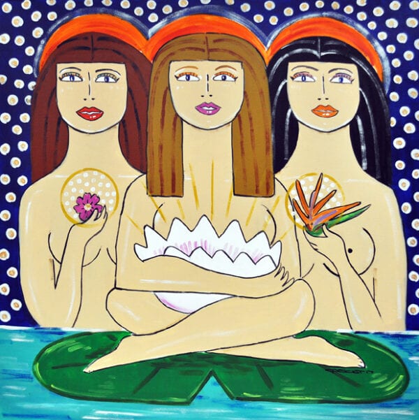 The flowers in Trinity Within hold special meanings. Water Lilies (a recurring element in my work) represent rebirth. Cosmos are often seen as symbols of love and peace. Most importantly, the Bird of Paradise represents the exploration of unchartered territories and the search for one’s personal paradise.