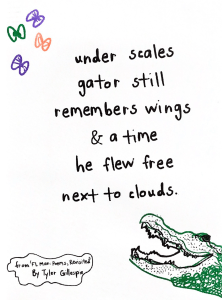 I’ve made standard-size prints for a wall and smaller, “pocket poetry prints” like this post’s gator and fruit print, which is included with pre-orders for my forthcoming book Florida Man: Poems, Revisited.