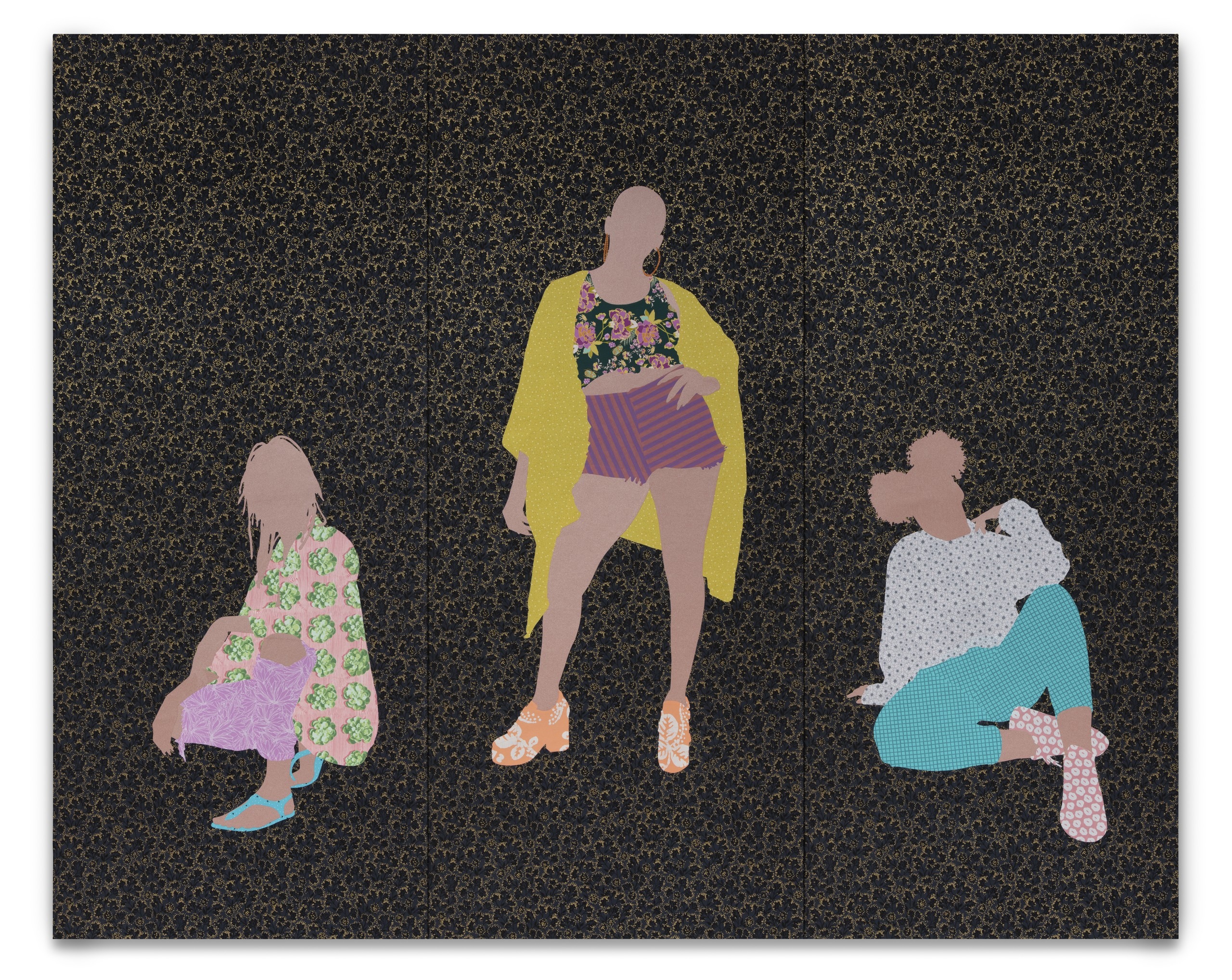 In a process that includes using a “sitter” she photographs before transferring the silhouette to her magical canvases and adorning them in brightly colored textiles and threads, Swaby’s pantheon of female figures feel at once like goddesses and warriors, while also reminding us of beloved dollies from our childhoods.
