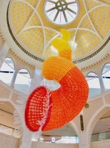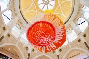 Early this year I was commissioned to create a sprawling sculpture for the Dubai Mall. It’s an enormous and amazing place with more restaurants and attractions than some small cities. I brought a crew of seasoned veteran assistants with me and we had a fantastic time. The sculpture we made was titled Skyward. Very similar to Pisces, the sculpture I posted about last week. Skyward employed a gradient of yellow to orange then red. Getting the balloons to Dubai was a challenge in part due to serious winter storms that were interrupting shipping around the US. Each of my team members was to carry one extra suitcase filled with 50 pounds of balloons. Unfortunately most of the balloons didn’t make it in time for us to bring them so I had to rely on a distributor in Dubai that by chance had exactly what I needed to make the project happen. I had reached out to them several times in advance but had not gotten any response. Perhaps the international phone call was difficult. But once we did finally connect it all worked out perfectly. I had tried to bring a yellow/orange color called goldenrod but because it didn’t make it, we put an orange balloon inside a yellow one and when inflated, the color was very similar and was exactly what the gradient needed.