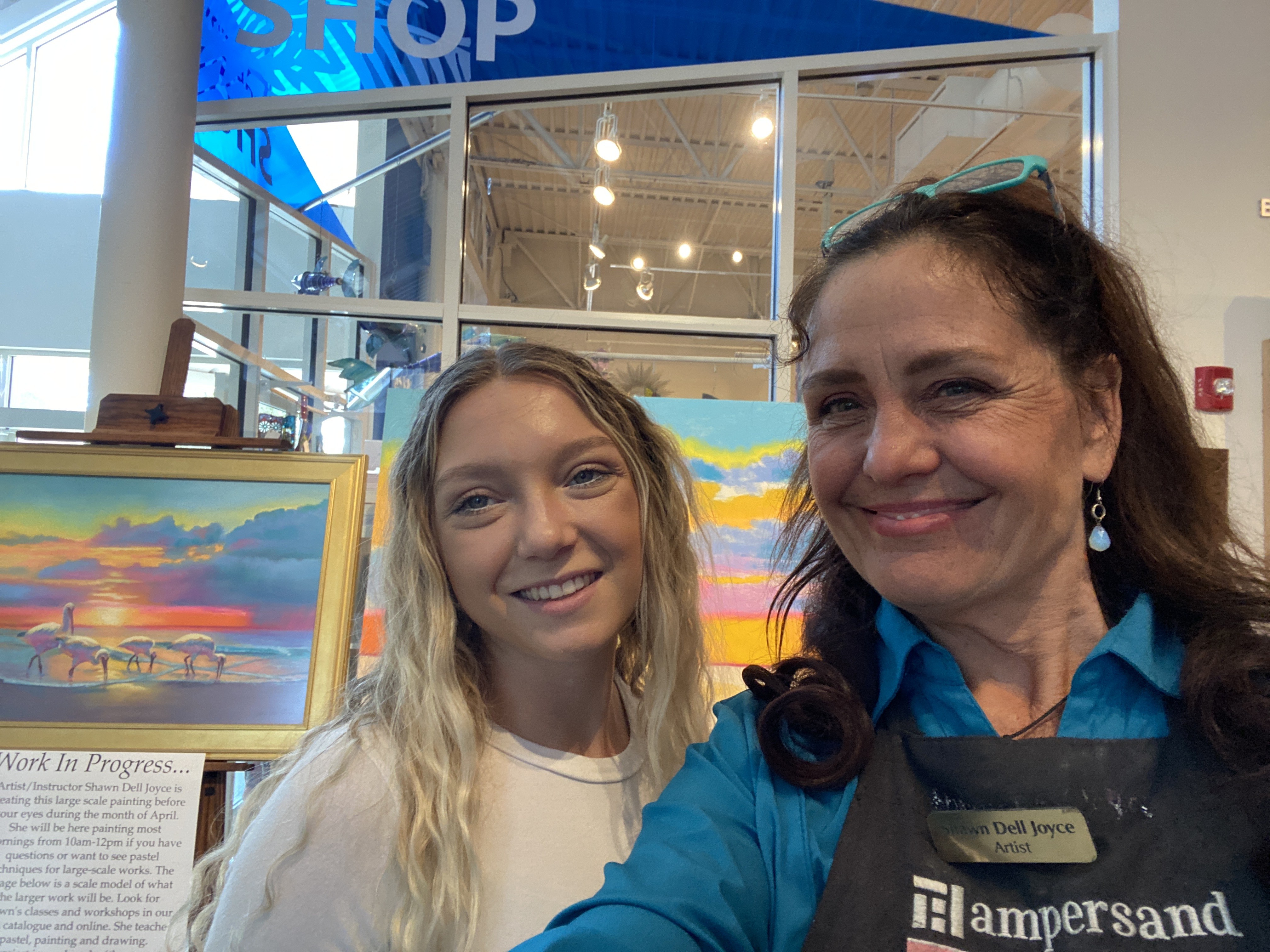 I’m shocked by the outpouring of support from the public for this simple idea. People are coming in to ask me how I captured that light, and how do you use pastels on a sanded surface, what went into planning this large painting, and where do I get my inspiration. I advertised regular painting hours of 10am-noon (I work full-time as a teaching artist in addition to this) and all week there have been people waiting for me to arrive, visiting during the painting time in a steady stream, and some lingering after I’ve left for the day. I shoot photos of my visitors and post them to my social media.