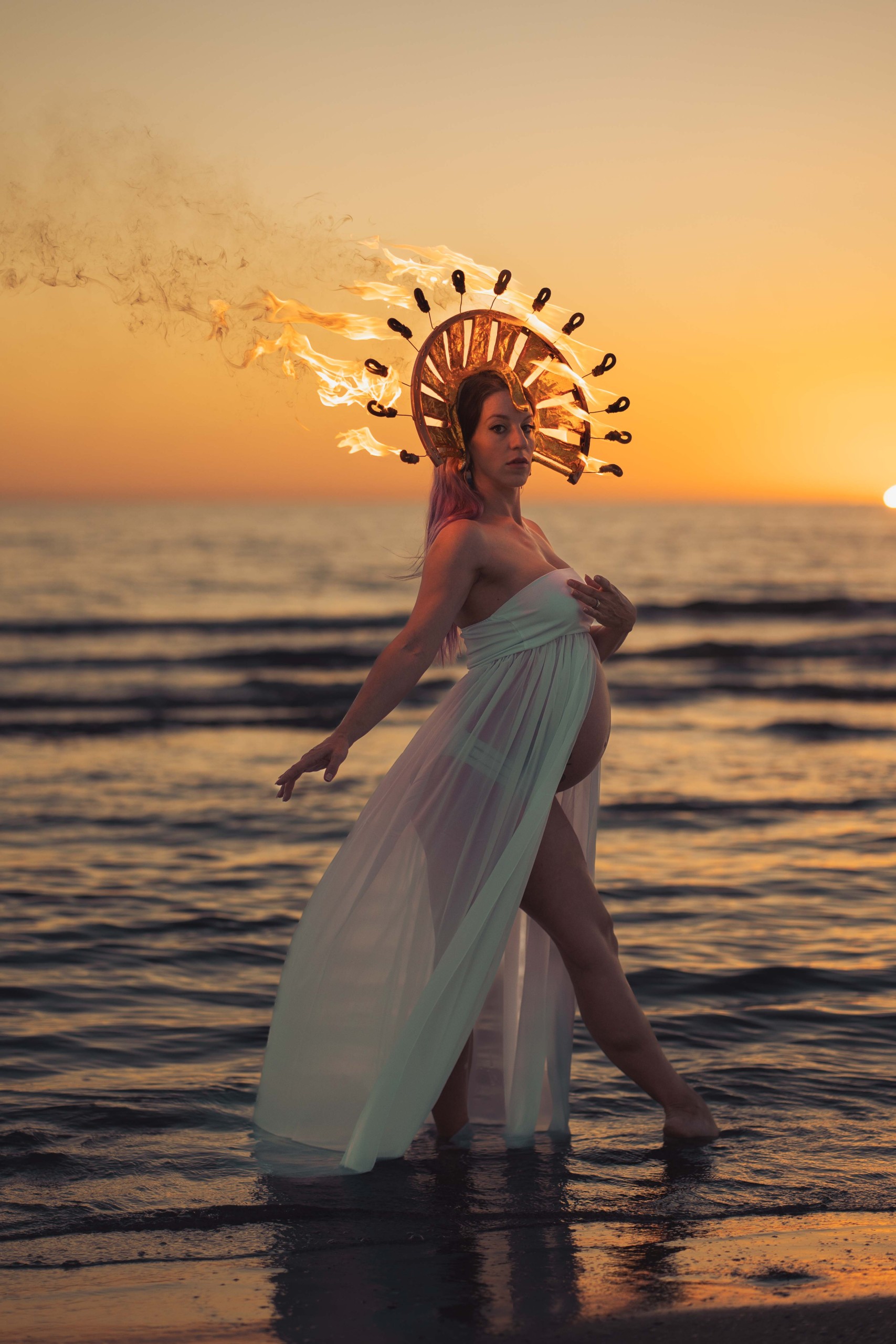 As we strolled through the soft white sand towards the calm water at Treasure Island beach, the clear skies above seemed to promise the perfect backdrop for a sunset – possibly the best in all of Florida. I was accompanied by my long-time friend Mary Susan. Mary Susan, 32 weeks pregnant, not only carried the radiant glow of a soon to be mother but also assisted me with lugging photo gear, a magnificent headdress, and even a can of fuel. Looking back, maybe an extra pair of hands would have been helpful, but hey, we’re a duo of independent women .