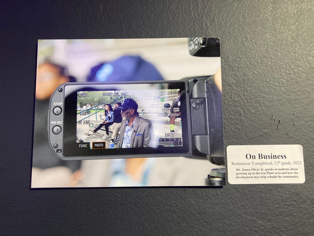 You can see the documentation of the interviews in several photographs on display in Through Our Eyes – The Professor by 6th grader Annalee Rapier and Shelter Talk by 8th grader Dion Taylor, History Lesson by 6th grader Brandon Laurence, Black History by 4th grader Juliet Mitchell and The Grio by 6th grader Charlotte Bass, Archival and On Business by 12th grader Rashannon Youngblood and Beginnings by 10th grader Ca’Mari Hopkins.