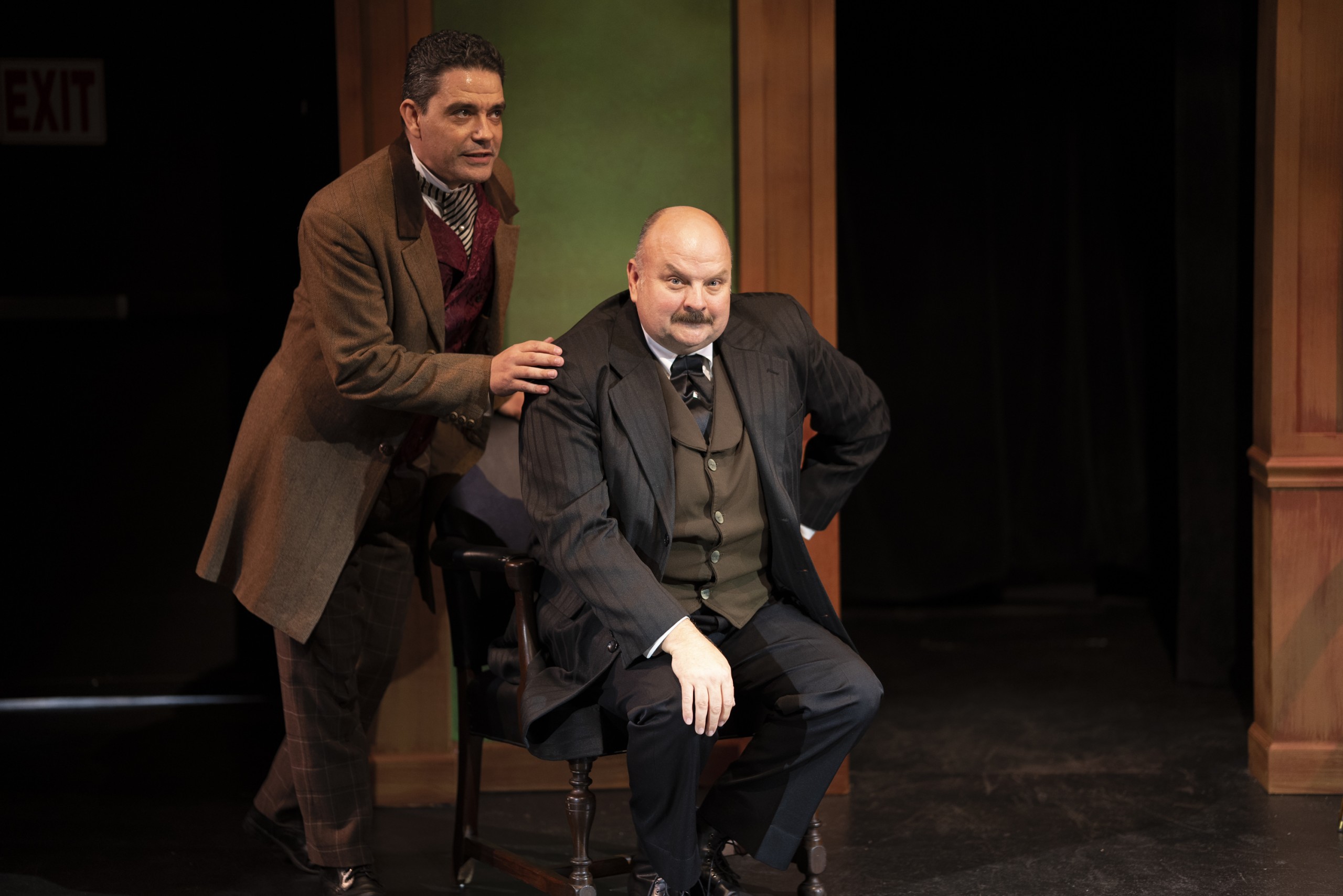 Hansen Scenic made chairs, two benches, and two doorway facades at either end of the stage, work as Holmes’s flat, Baskerville Manor, the Moors, the opera and even a stagecoach. This is a true example of less is more.