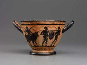Kind of like time traveling in that ‘90s TV series, Quantum Leap, to suddenly be confronted with the 20th and 21st century stuff. How does the mind reconcile being immersed in a Greek Black-Figure Skyphos drinking cup from ca. 490 BC, and other similar everyday functional objects to standing in front of Bob Rauschenberg’s 1976 Realm (Tracks), a fiberglass and dirt cast of some tire tracks, or Lorna Simpson’s 1994 III (Three Wishbones in a Wooden Box)?