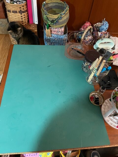 The Garage: It’s my “storage facility” for many supplies. Rack cards (colorized) in bins, strips of paper in boxes, Ikea linen storage bags for reed (not using for this EA project) hanging from a shelf. The washing machine is my “before and after” prep area for cutting large pieces of cardboard on a desk paper cutter. It also serves as the table for finishing off pieces with a final coat of acrylic spray.