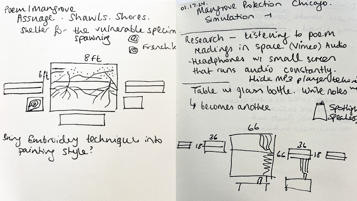 The image above shows my notes for my initial idea for the EAE. I wanted to create a new shape on the wall with the canvas, something spiral in shape. I was also dabbling with the idea of incorporating embroidery techniques into my brush strokes. As time progressed different thoughts percolated; the idea for the size of the canvas shifted to something more manageable in the time frame and the main storyline developed.