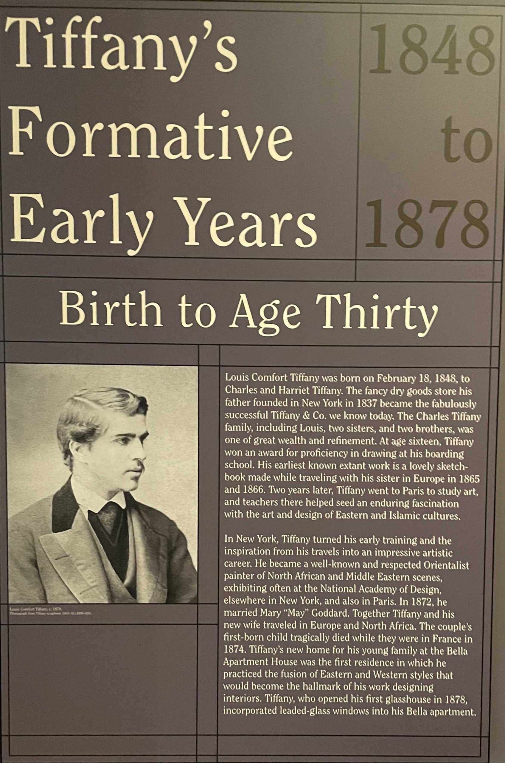 Tiffany was born in 1848 shortly after his father, Charles Tiffany, founded a modest venture in New York that grew to become the most prestigious silver and jewelry company in America — Tiffany & Co. Does Breakfast at Tiffany’s ring a bell? Demonstrating early artistic promise, the young Tiffany went on to study art in Paris, and teachers there helped seed an enduring fascination with the art and design of Eastern and Islamic countries.