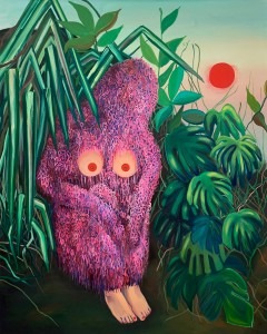 In my work, “Con Los Ojos Tristes” and “Kudzu People” the figures covered in pink and green kudzu emerge from the wild, natural landscapes with sinister poses. These figures are both covered and protected from the outside world. Invasive plants, like kudzu, have the ability to protect a moment in time and can overtake their land once more, similar to the plants that have covered the now uninhabited city of Chornobyl. By creating a monstrosity of women covered in invasive plant species, I subvert the misogynistic attitude that women need to be tamed and controlled-or beholden. In the work, they become empowered by these plants and reclaim their space. “Con Los Ojos Tristes” and “Kudzu People” embrace hybrid monstrosity as a kind of agential power.